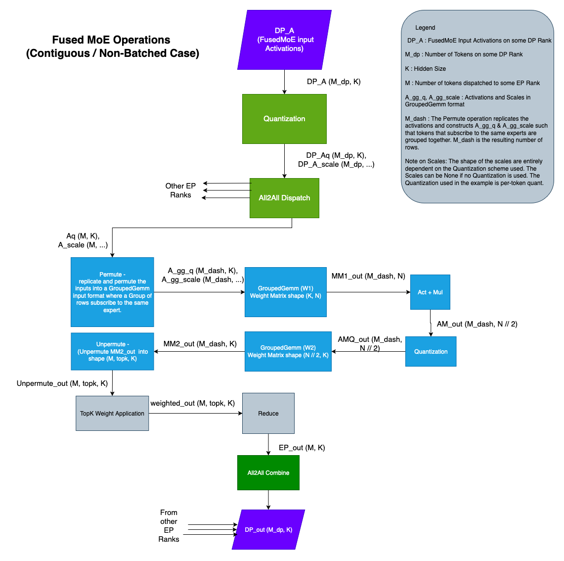 The FusedMoE operation is generally made of multiple operations, in both the Contiguous and Batched variants, as described in the diagrams below